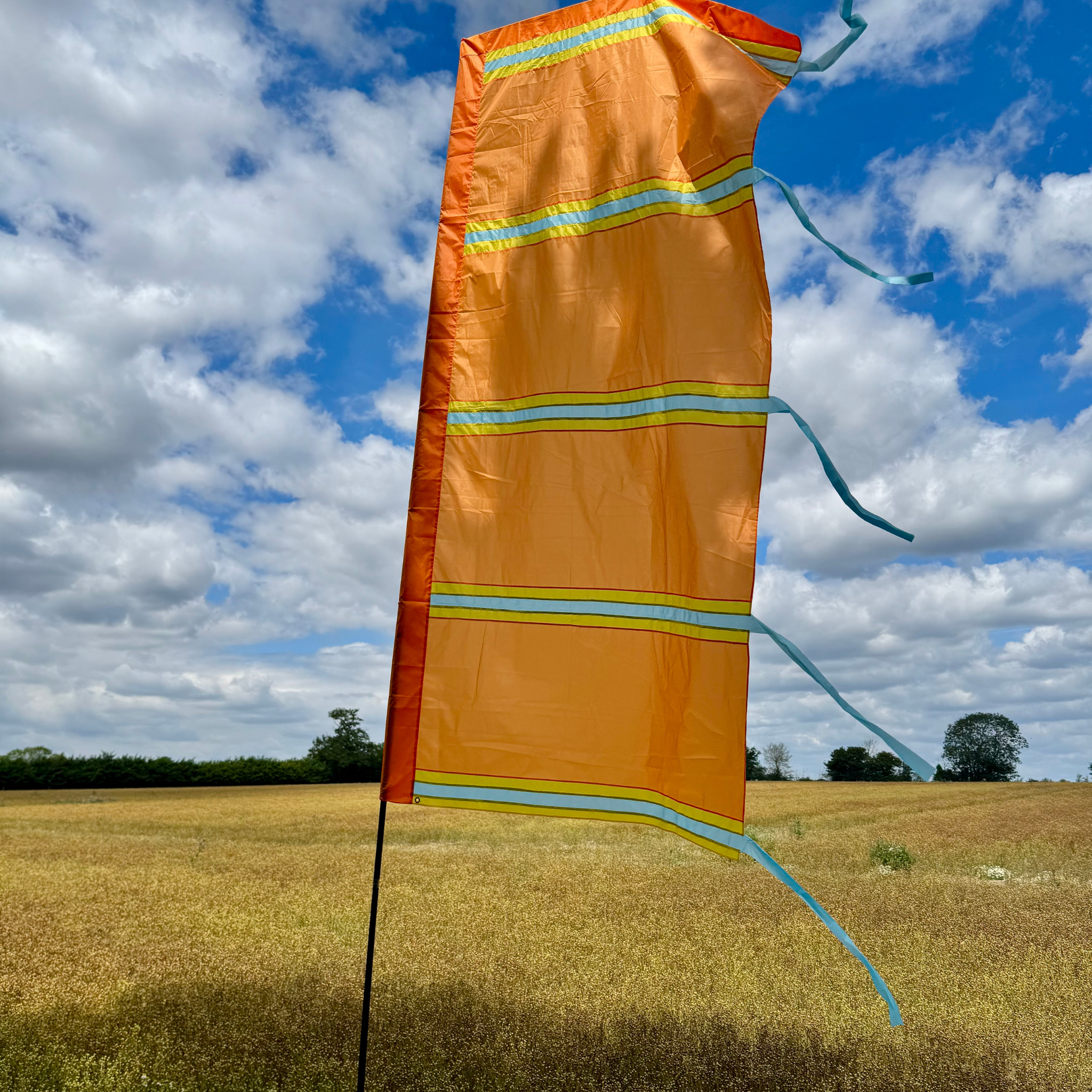 Turn heads with our Orange Sola Festival Flag, made from recycled plastic bottles and designed to bring bold energy to any event. Featuring a vibrant orange base with pale blue and yellow stripes, this flag is finished with flowing blue tassels that dance in the wind, adding colour and movement to your celebration.